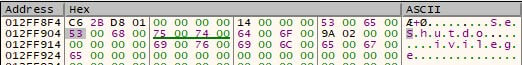 The numeric value of this character, stored in EAX, is used to calculate the offset on the stack to place the missing wide characters to complete the “SeShutdownPrivilege” wide string. The two mov-instructions in the image place the missing wide characters at the calculated offset. The image below shows the original wide string.